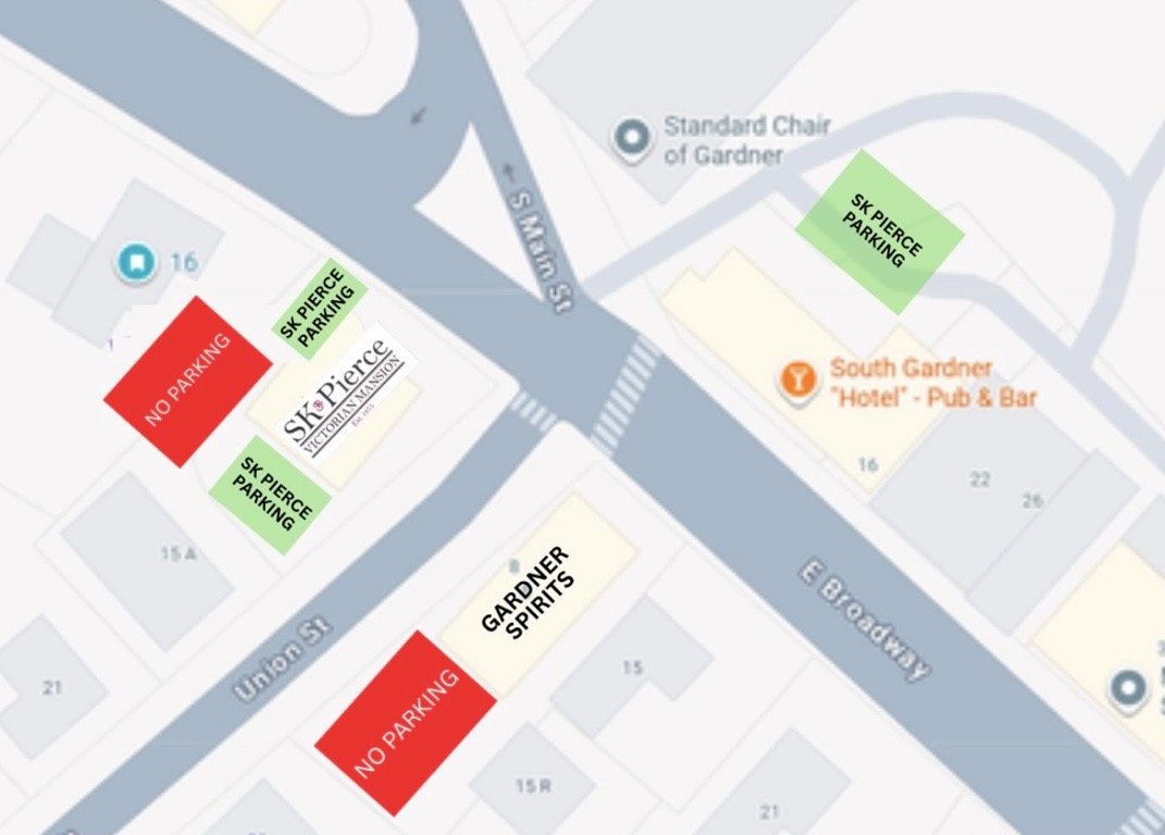 Parking for all visits to the SK Pierce Mansion is available in the limited spaces directly next to the mansion on Union Street, East Broadway and West Broadway, as well as on-street parking along both roads. For larger events, additional parking is available behind the South Gardner Hotel.